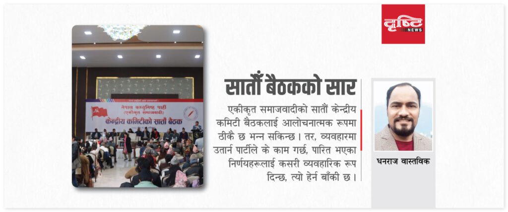अन्त्यमा, यसरी हेर्दा एकीकृत समाजवादी पार्टीको सातौं केन्द्रीय कमिटी बैठकलाई आलोचनात्मक र लिखत रूपमा ठिकै छ भन्न सकिन्छ । तर, व्यवहारमा उतार्न पार्टीले के काम गर्छ, पारित भएका निर्णयहरूलाई कसरी व्यवहारिक रूप दिन्छ, त्यो भने हेर्न बाँकी छ ।