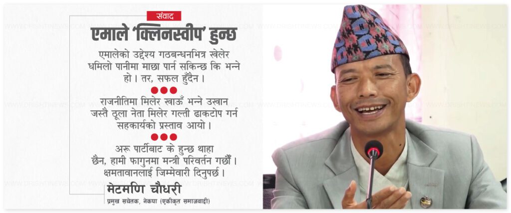 एमालेको भूमिकामाथि गठबन्धन बैठकले आशंका व्यक्त ग¥यो । र, सहमतिको ठोस प्रस्ताव माग्यो । त्यसपछि एमाले हच्कियो । राष्ट्रिय सभामा सत्तापक्ष र प्रतिपक्षको महागठबन्धनको च्याप्टर क्लोज भयो । एमालेले सत्तागठबन्धनसँग राष्ट्रिय सभा निर्वाचनमा सहकार्यको प्रस्ताव किन ग¥यो ? सत्तारुढ प्रमुख दुई दल सकारात्मक हुँदा पनि किन राष्ट्रिय सभा निर्वाचनमा महागठबन्धन बन्न सकेन ? सत्तारुढ गठबन्धनसँग सहकार्यको प्रस्ताव गरेको प्रतिपक्ष दल एमालेको भित्री चाहना के थियो ? अब राजनीतिक कसरी अगाडि बढ्छ ? यी र यस्तै विषयमा नेकपा एकीकृत समाजवादीका सचेतक मेटमणि चौधरीसँग दृष्टिले गरेको कुराकानीको सम्पादित अंश :