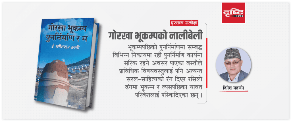 सुपरिचित साहित्य स्रष्टा इन्जिनियर गणेशराज वस्तीको नयाँ कृति ‘गोरखा भूकम्प, पुनर्निर्माण र म’ प्रकाशनमा आएको छ । ‘गोरखा भूकम्प’ भनेर चिनिने २०७२ वैशाख १२ मा गएको विनाशकारी भूकम्प जाँदादेखि पुनर्निर्माणसम्मका सम्पूर्ण दृश्यलाई सारमा खिच्ने हुटहुटीबाट अभिप्रेरित भई लेखकले यो पुस्तक लेखेका हुन् । दुई सय पचास पृष्ठको पुस्तक ‘गोरखा भूकम्प, पुनर्निर्माण र म’ अध्ययन गरिसक्दा सारमा यस्तै लाग्छ ।