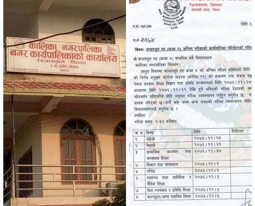 चितवनका सबै पालिकाहरुले सम्बन्धित विद्यालयमा नै कक्षा ८ को परीक्षा केन्द्र तोकी संचालन गर्ने निर्णय गरे पनि कालिका नगरपालिकाले भने मन्त्रालयको निर्णय मान्नृुपर्ने बाध्यता नभएको भन्दै यस अगाडिको परीक्षा केन्द्र कायमै गर्ने र मिति भने निर्देशन अनुसार नै सार्ने भएको छ । देशभर कोरोना भाइरस संक्रमणको त्रासले भीडभाड र आवतजावतमा कमि गर्नुपर्नेमा कालिका नगरपालिकाले भने कक्षा ८ को परीक्षा अन्र्त्विद्यालय गरेर दादगिरी देखाएकोमा प्याब्सन अन्तर्गतका विद्यालयहरुले दुःखेसो व्यक्त गरेका छन् ।