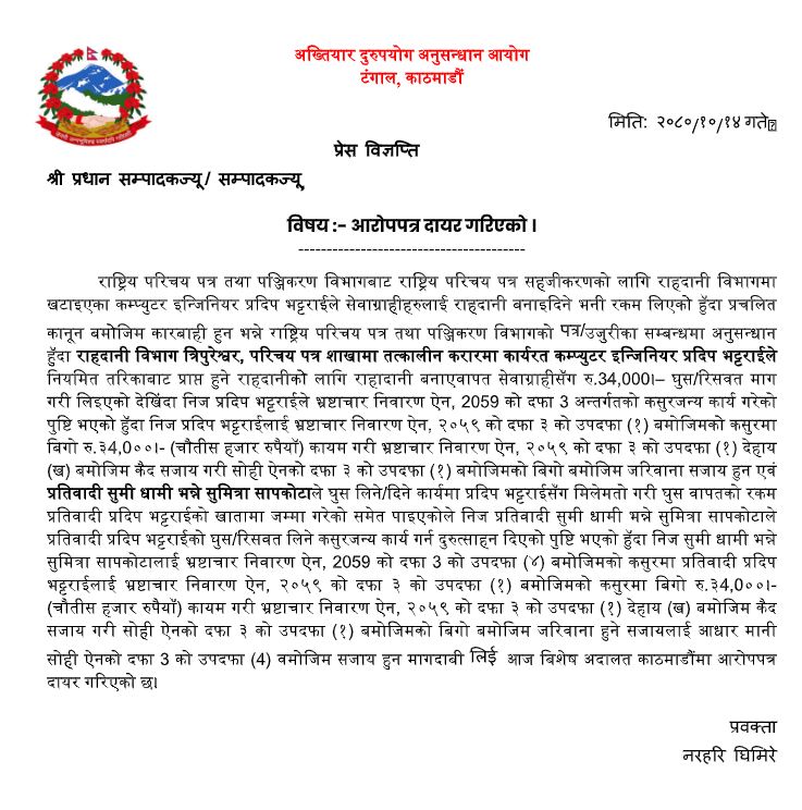 राष्ट्रिय परिचय पत्र तथा पञ्जिकरण विभागबाट राष्ट्रिय परिचय पत्र सहजीकरणको खटाइएका प्रदीप भट्टराईले राहदानी बनाएवापत सुमी धामी भन्ने सुमित्रा सापकोटाबाट ३४ हजार घुस लिएको आरोपमा अख्तियार दुरुपयोग अनुसन्धान आयोगले विशेष अदालतमा मुद्दा दायर गरेको हो ।