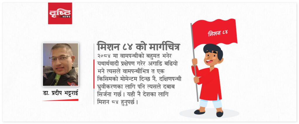 त्यसको प्रस्थान विन्दु फेरि पनि २०८४ मा वामपन्थीको बहुमत भनेर अगाडि बढ्नु नै हो । त्यसले वामपन्थी भित्र त एक किसिमको मोमेन्टम मिल्छ नै, दक्षिणपन्थी ध्रुवीकरणका लागि पनि दबाब सिर्जना हुन्छ । त्यसको विश्वसनीय आधार बन्यो भने अहिले नै त्यही ध्रुवीकरणको धारमा वामपन्थी सरकार बन्न सक्छ । त्यसो भए विचारका आधारमा देश र जनताले सत्तापक्ष र प्रतिपक्ष पाउँछन् । र, देश राजनीतिक स्थायित्वको आलोकमा ‘समृद्ध नेपाल ः खुशी नेपाली’को राजमार्गमा आउन सक्छ ।