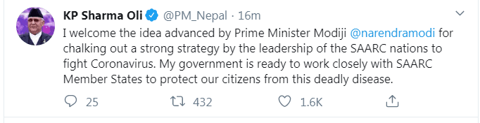 भारतीय प्रधानमन्त्री नरेन्द्र मोदीले कोरोना भाइरसको संक्रमण र यसका असरविरुद्ध सार्क राष्ट्र एकजुट भएर लड्ने प्रस्तावमा नेपालका प्रधानमन्त्री केपी शर्मा ओलीले समर्थन जनाएका छन् । ओलीले ट्वीटमार्फत मोदीको प्रस्तावको स्वागत गर्दै एकजुट भएर अघि बढ्ने बताएका छन् ।