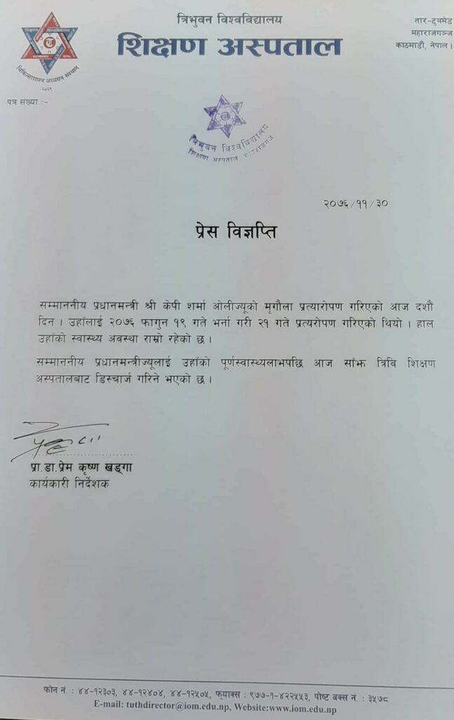प्रधानमन्त्री ओलीलाई मिर्गाैला दिने समिक्षा संग्रौलाको डिस्चार्ज भइसकेको छ ।