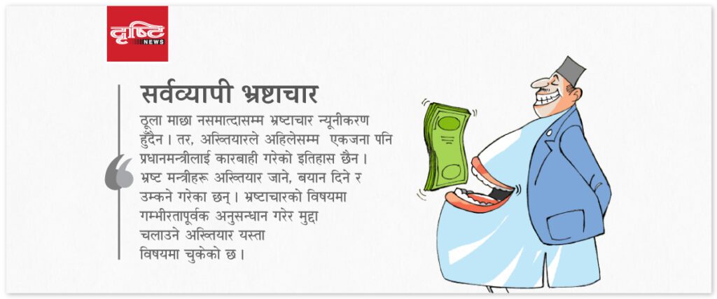 नीतिगत भ्रष्टाचार डरलाग्दो अवस्थामा भइरहेको छ । तत्कालीन प्रधानमन्त्री केपी शर्मा ओलीले गिरीबन्धु टि–इस्टेटमा गरेको नीतिगत भ्रष्टाचारलाई सर्वोच्च अदालतले केही दिनअघि मात्रै प्रमाणित गरिदिएको छ । यती, ओम्नी, वाइडबडी, नक्कली लडाकूलगायतका काण्डको अझै छिनोफानो भइसकेको छैन । भ्रष्टाचारको विषयमा गम्भीरतापूर्वक अनुसन्धान गरेर मुद्दा चलाउने अख्तियार यस्ता विषयमा चुकेको छ ।