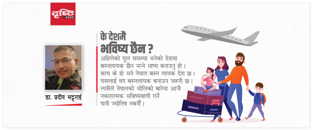 यी सजिलै बन्ने बिकाऊ समाचार वर्षौयता चलिरहँदा नेपालको छवि एक बस्नै नहुने देशको रूपमा निर्माण भैरहेको छ । यो सँगै एक जबर्जस्त भाष्य बनिसकेको छ, त्यो के भने ‘नेपालमा भविष्य नै छैन ?
