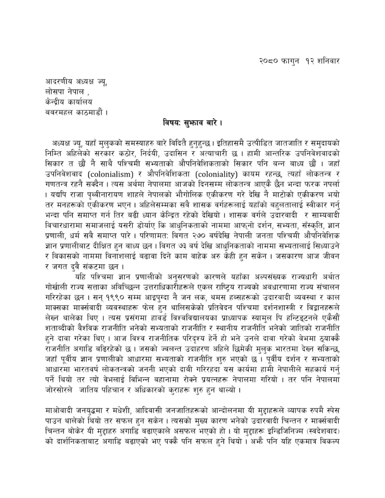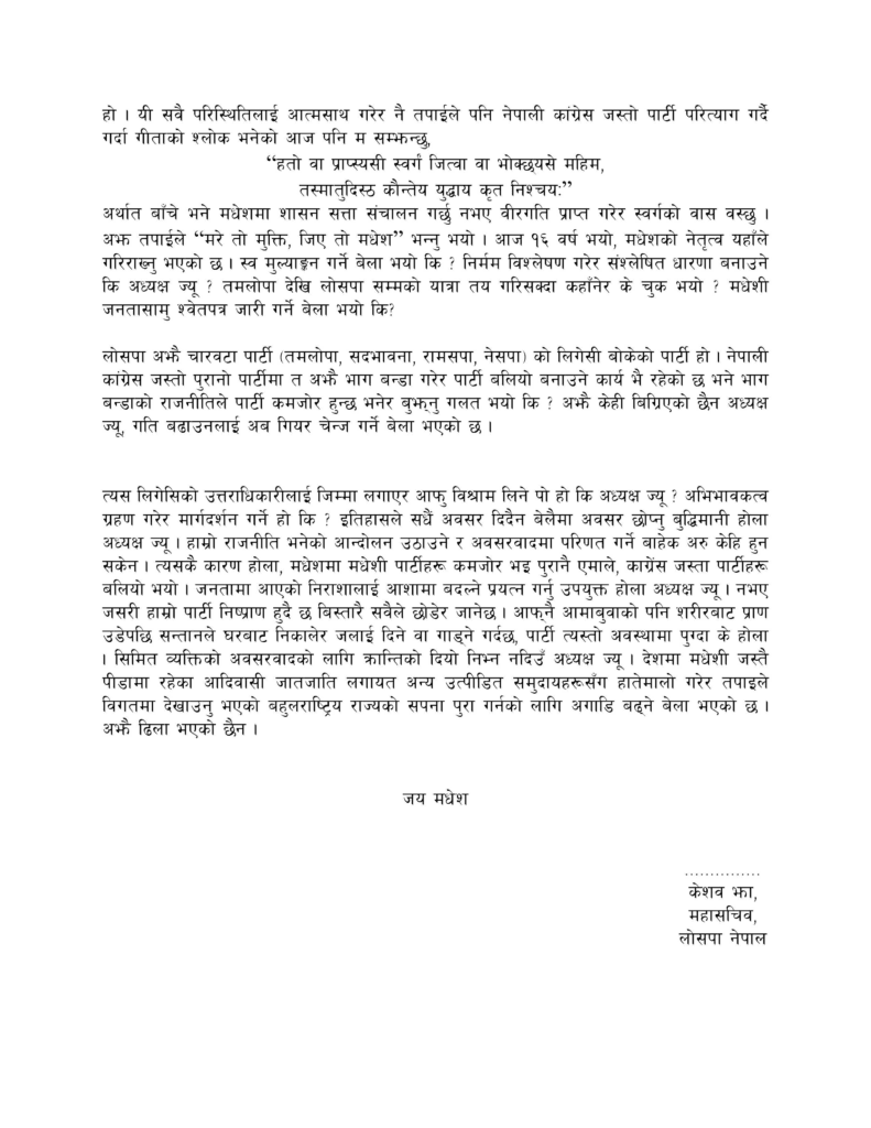 साथै उनले नेतृत्वको स्वःमूल्यांकन गर्ने बेला भयो कि भन्दै प्रश्न सोधेका छन् । ‘आज १६ वर्ष भयो, मधेसको नेतृत्व यहाँले गरिराख्नु भएको छ । स्वःमूल्यांकन गर्ने बेला भयो कि ? निर्मम विश्लेषण गरेर संश्लेषित धारणा बनाउने कि अध्यक्ष ज्यू ? तमलोपादेखि लोसपासम्मको यात्रा तय गरिसक्दा कहाँनेर के चुक भयो ? मधेसी जनतासामु श्वेतपत्र जारी गर्ने बेला भयो कि ?,’ उनले भनेका छन् ।