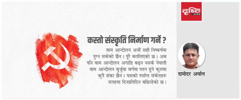 यसै सन्दर्भमा संस्कृति निर्माणमा वाम आन्दोलनको भूमिकाबारे चर्चा गर्न खोजिएको हो । वाम आन्दोलनले संस्कृतिको संरक्षण गर्ने हो कि यसको विकास गर्ने हो ? अथवा कस्तो प्रकारको विकास गर्ने हो ? निक्र्यौल गर्ने बेला खस्कँदै छ ।