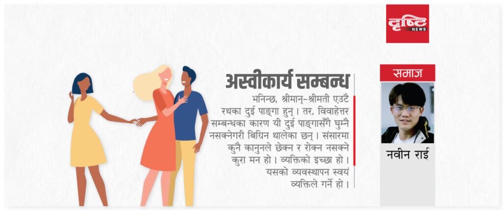 विवाहेत्तर सम्बन्ध पश्चिमाकरणको अन्धो नक्कल हो । विदेशी संस्कारमा यो ठूलो कुरा होइन । हाम्रो समाज त्यति उदार भइसकेको छैन । विवाहेत्तर सम्बन्धलाई समाजले पचाइहालेको अवस्था छैन । यस्ता सम्बन्धले दुई जनाबीचको सम्बन्धमा मात्रै दरार पैदा गर्दैन । यसले परिवारका सम्पूर्ण सदस्यलाई नै तनाव दिन्छ । तनाव मात्रै होइन, अपराधसम्म निम्त्याउँछ ।