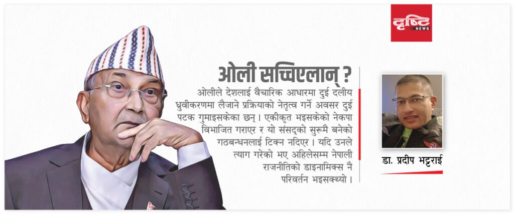 नेपालको वैचारिक राजनीतिक ध्रुवीकरणका लागि अझै पनि कोही निर्णायक छ भने त्यो ओली नै हुन् । उनले यसअघि दुई पटक त्यो सुनौला मौका गुमाइसकेका छन् । पहिलो पटक, एकीकृत भइसकेको नेकपा र एमाले विभाजित गराए भने दोस्रो पटक यो संसद्को सुरुमै बनेको गठबन्धनलाई टिक्न दिएनन् ।