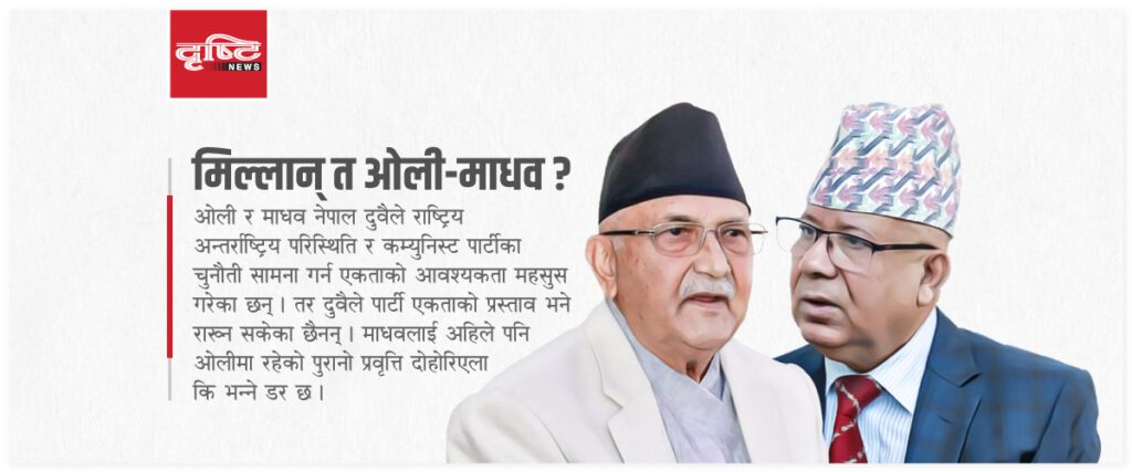 ओली र नेपालबिच करिब अढाई वर्षपछि शनिवार साँझ ‘सम्बन्ध सुधार’का लागि ‘वान टु वान’ वार्ता भएको छ । तत्कालीन नेकपा विभाजन नहुँदै ओलीविरुद्ध दाहाल र नेपाल उत्रिएपछि सम्बन्धमा दरार उत्पन्न भएको थियो । २०७८ भदौमा पार्टी विभाजन भएपछि दुई नेताबिच बोलचाल बन्द थियो ।