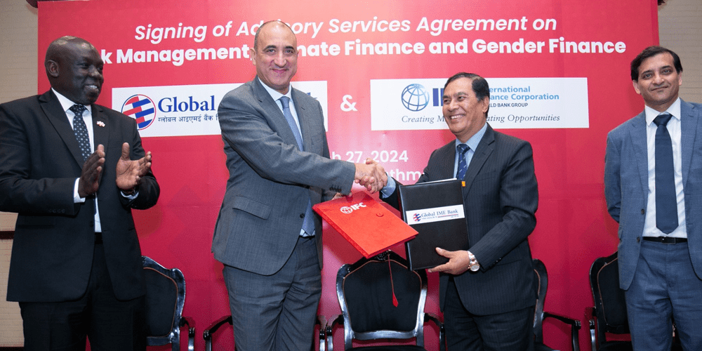 जोखिम व्यवस्थापन, जलवायु वित्त तथा लैङ्गिक वित्त क्षेत्रमा आईएफसीले परामर्श सेवा प्रदान गर्ने गरी ग्लोबल आइएमई बैंकका प्रमुख कार्यकारी अधिकृत रत्नराज बज्राचार्य तथा आईएफसीको तर्फबाट दक्षिण एशिया क्षेत्रीय सल्लाहकार तथा अपस्ट्रीम प्रबन्धक मेहदी चेरकाउई बीच सम्झौतापत्रमा हस्ताक्षर भएको हो ।