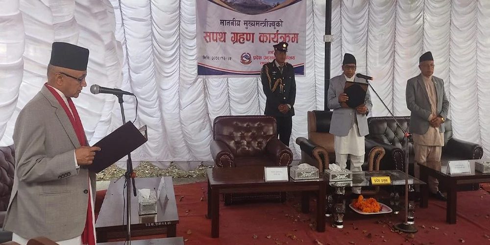 पोखरा । गण्डकी प्रदेशमा नव नियुक्त मुख्यमन्त्री खगराज अधिकारीले पद तथा गोपनीयताको शपथ लिएका छन् । प्रदेश प्रमुख डिल्लीराज भट्टले उनलाई संविधानको धारा १६८ (२) अनुसार मुख्यमन्त्रीको शपथ गराएका हुन् ।