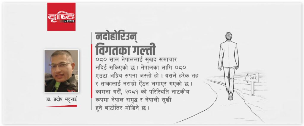 प्रकारान्तरमा राज्य असफल हुने दिशातिर तीव्र गतिमा हुइँकिरहेको छ । २०७९ को आमनिर्वाचनमा जनता जनार्दन नहुँदा देशले नोक्सान भोग्नुपरेको वर्षका रूपमा २०८० साल जबरजस्त रूपमा अंकित भयो । यो विगत हो । यसलाई सच्याउन सकिँदैन, बढीमा त्यसबाट पाठ लिएर भविष्यमा गल्ती नदोहो¥याउन सकिने मात्र हो ।