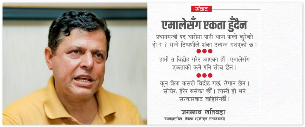 उहाँले भनेको गलत होइन । वास्तवमा माधवकुमार नेपाल कोटेश्वरबाट बुढानीलकण्ठ जानु पनि पर्दैन । म गएँ है भने मात्रै पनि पुग्छ । तर, यति महत्त्वपूर्ण राजनीतिक शक्तिलाई नजरअन्दाज गरी हिँड्ने जुन प्रवृत्तिहरू सुरुवातदेखि नै देखारेकाछन्, यो चिन्ताको विषय छ । सम्भवतः माधवकुमार नेपालले त्यसरी हिँड्न पर्दैन, हिँड्न हुँदैन भनेर कसैले सोचिरहेको छ भने, उसले भविष्यमा हिजोभन्दा अगाडिको जस्तो व्यवहार अब गर्दैन । माधवकुमार नेपाललाई साथ लिएर हिँड्ने कोसिस गर्छ । एकीकृत समाजवादीलाई अवमूल्यन गर्दै जाने प्रवृत्ति देखिइरह्यो भने, त्यसको राजनीतिक प्रतिवाद कुन ठाउँमा कसरी गर्नुपर्छ, ऐन मौकामा पार्टीले गर्छ ।