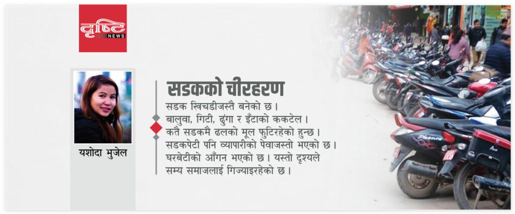 सडक खिचडीजस्तै बनेको छ । बालुवा, गिटी, ढुंगा र इँटाको ककटेल । सडकपेटीमा दोकानेको डमी । क्या गज्जबको ‘गेटअप’ । यस्तो दृश्यले सभ्य समाजलाई गिज्याइरहेको छ ।