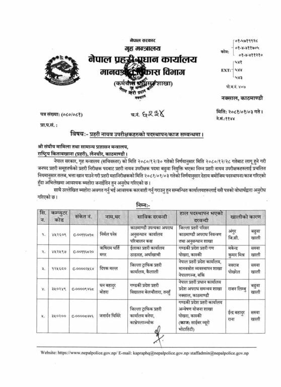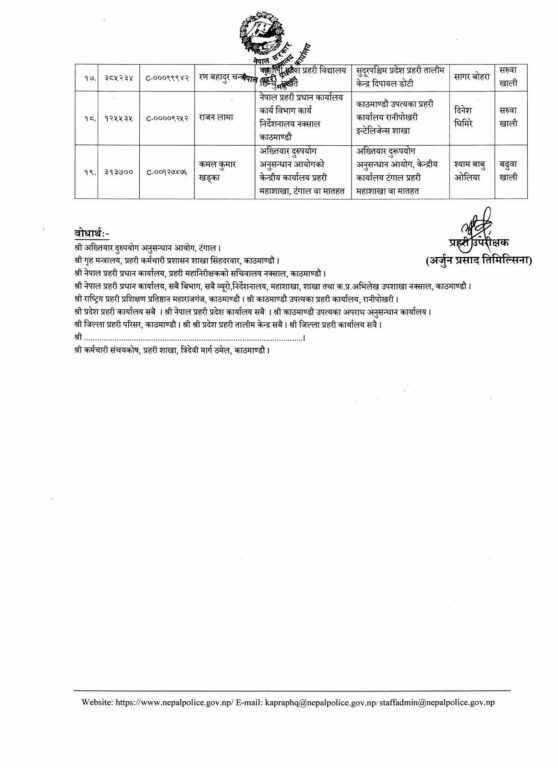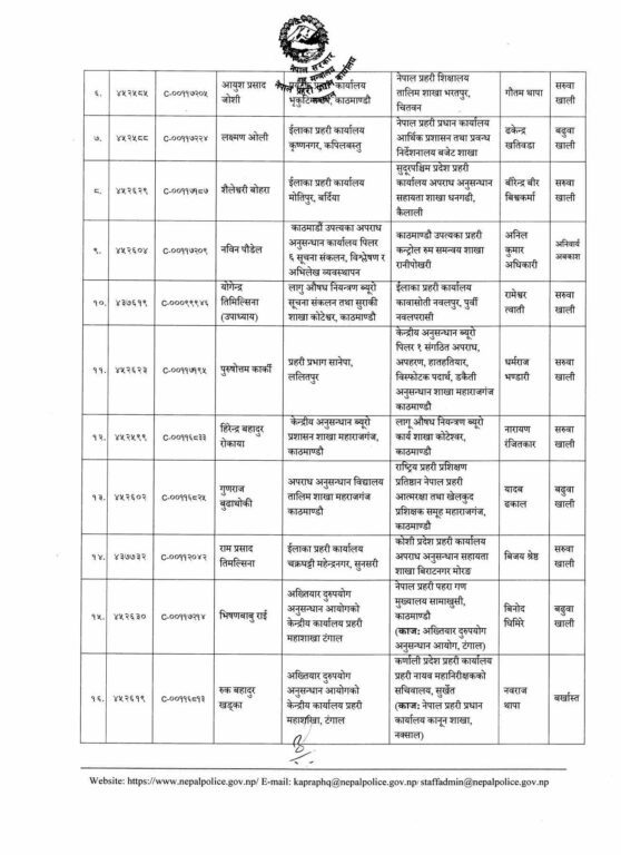 पहिलो नम्बरमा बढुवा भएका डीएसपी निर्मल पनेरुलाई जिल्ला प्रहरी परिसर काठमाडौँको अपराध नियन्त्रण तथा अनुसन्धान शाखाको जिम्मेवारी दिइएको छ ।