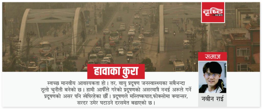 वायु प्रदूषण समग्र नेपाल र विशेषगरी राजधानी काठमाडौँका लागि सर्वकालिक समस्या र चुनौतीको विषय हो । काठमाडौंको आकाशलाई तुवाँलोले ढाकेको छ । वायु प्रदूषणका कारण बिरामीको संख्या बढ्दै गएको छ । मानव स्वास्थ्यमात्र होइन, प्रकृतिको स्वास्थ्य र पारिस्थितिकीय प्रणालीमा समेत यसले नकारात्मक प्रभाव पार्ने वैज्ञानिकहरुको अध्ययनले देखाएका छन् ।
