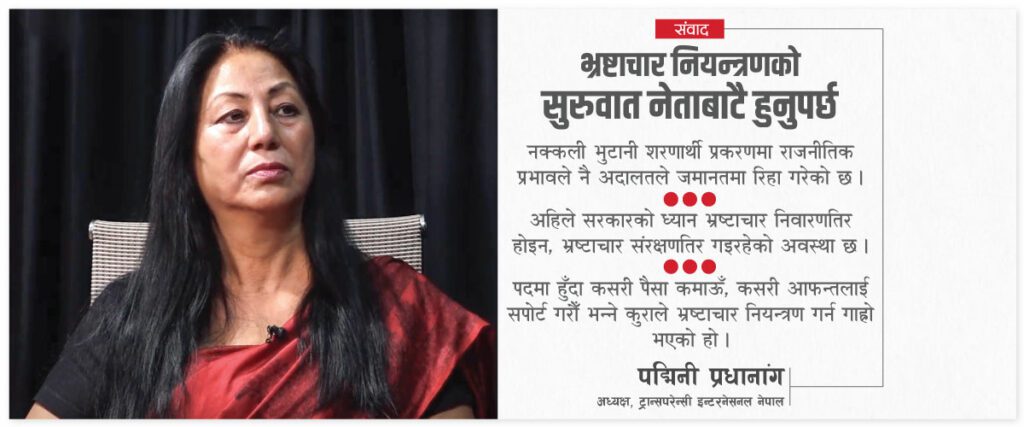 ट्रान्सपरेन्सी इन्टरनेशनलले सार्वजनिक गरेको रिपोर्टअनुसार नेपाल यस वर्ष पनि भ्रष्टाचार व्याप्त हुने मुलुककै सूचीमा परेको छ । भ्रष्टाचार अवधारणा सूचकाङ्कमा नेपाललाई ३५ अंक दिइएको छ । १८० मुलुकमध्ये नेपाल १०८औँ स्थानमा छ । ट्रान्सपरेन्सी इन्टरनेशनलको रिपोर्टअनुसार नेपालको सुशासनको अवस्था नाजुक छ । सरकार र राजनीतिक दलको कार्यशैली, कमजोर न्याय प्रणाली तथा न्यायालयभित्रको विकृतिले दण्डहीनता बढाएको छ । भ्रष्टाचारको अवस्था र राज्यका निकायको भूमिकाबारे ट्रान्सपरेन्सी इन्टरनेशनल नेपालकी अध्यक्ष पद्मिनी प्रधानांगसँग दृष्टिले गरेको कुराकानीको सम्पादित अंशः
