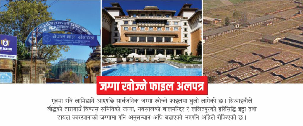 गृहमा रवि लामिछाने आएपछि सार्वजनिक जग्गा खोज्ने फाइलमा धुलो लागेको छ । सिआइबीले बौद्धको तारागाउँ विकास समितिको जग्गा, नक्सालको बालमन्दिर र ललितपुरको हरिसिद्धि इट्टा तथा टायल कारखानाको जग्गामा पनि अनुसन्धान अघि बढाएको भएपनि अहिले रोकिएको छ ।