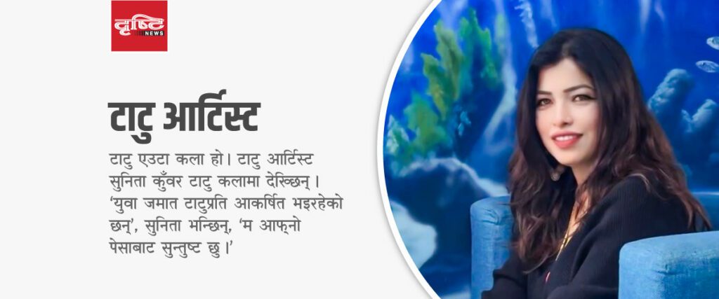 ‘टाटु एउटा कला हो । नेपालमा पनि यसको क्रेज बढ्दो छ । पछिल्लो समय युवा वर्गमा टाटु खोप्ने लहर नै चलेको छ । विशेषगरी कलाकारिता वा मोडलिङ क्षेत्रमा रमाइरहेकाहरु ‘फेसन’का रुपमा शरीरका विभिन्न अंगमा टाटु खोप्ने गरेका छन् । बढ्दो क्रेजसँगै टाटु आर्टिस्टहरुको पनि व्यस्तता थपिँदै गएको छ । यसैमध्येकी एक हुन्, सुनिता कुँवर