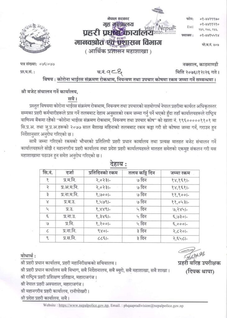 असईदेखि आईजिपीसम्मको बैशाख महिनाको तलब कट्टा गरी पैसा पठाउन आर्थिक प्रशासन महाशाखाका एसएसपी दीपक थापाले बुधबार देशभर परिपत्र गरेका छन्।