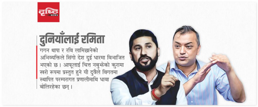 यस्तो अवस्थामा कांग्रेस महामन्त्रीसमेत रहेका विपक्षी दलका सांसद गगन थापाले रविको कमजोरीलाई राम्रोसँग केलाउँदै आएका छन् । यी दुईको अभिव्यक्तिले सिंगो देश दुई धारमा विभाजित भएको छ । आफूलाई चित्त नबुझेको कुरामा खरो रुपमा प्रस्तुत हुने यी दुवैले विगतमा स्थापित परम्परागत प्रणालीमाथि धावा बोलिरहेका छन् ।