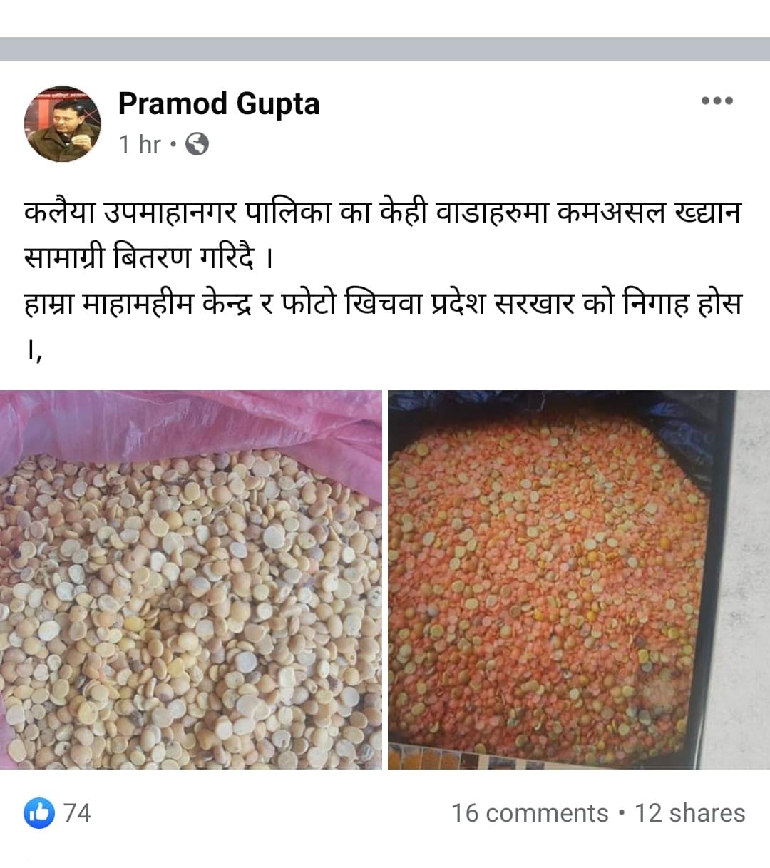 समाजवादी पार्टी नेपालका नेता तथा संविधानसभा सदस्य प्रमोद गुप्ताले सामाजिक संजालमै कलैया उपमहानगरपालिकाले गुणस्तरहीन खाद्यान्न बितरण गरेको भन्दै संघीय सरकार र प्रदेश सरकारको ध्यानाकर्षण गराएका छन् ।