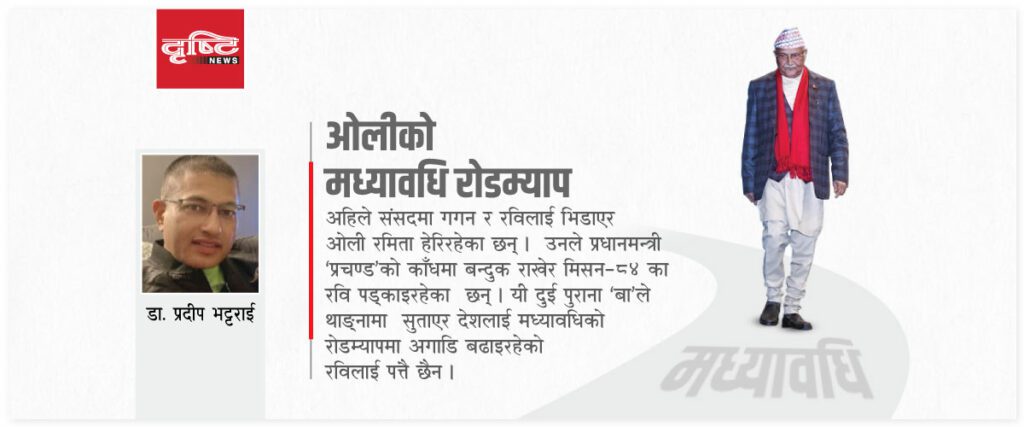 यसका लागि केही समयअघि भएको इलाम र बझाङको उपनिर्वाचनको जीतले उनलाई थप हौस्याएको छ । सँगै, थाहा पाएर हो वा नपाएर, प्रधानमन्त्री पुष्पकमल दाहाल ‘प्रचण्ड’ पनि उनका लागि काँध थापेर अगाडि बढिरहेका छन् । साँच्चै भन्ने हो भने अहिले ओलीले प्रचण्डको काँधमा बन्दुक राखेर मध्यावधिको दिशामा फायर खोलिरहेको जस्तो देखिन्छ ।