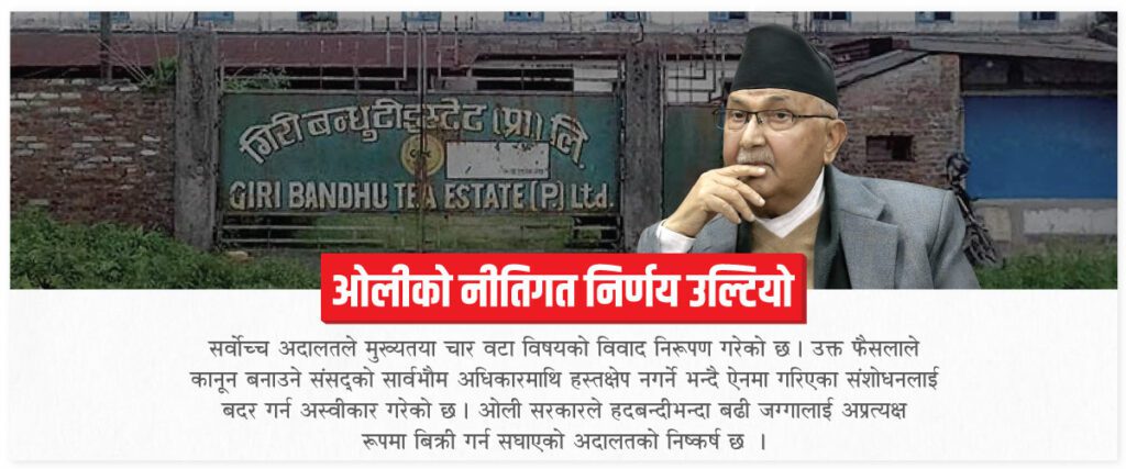 ओली नेतृत्वको मन्त्रिपरिषद्को १३ वैशाख २०७८ सालमा बसेको बैठकले गिरीबन्धु टी–इस्टेटलाई झापाको बिर्तामोड नगरपालिका–६ मा रहेको ३ सय ४३ बिघा १९ कठ्ठा १२ धुर जग्गा सट्टापट्टा गर्न स्वीकृति दिने निर्णय गरेको थियो ।