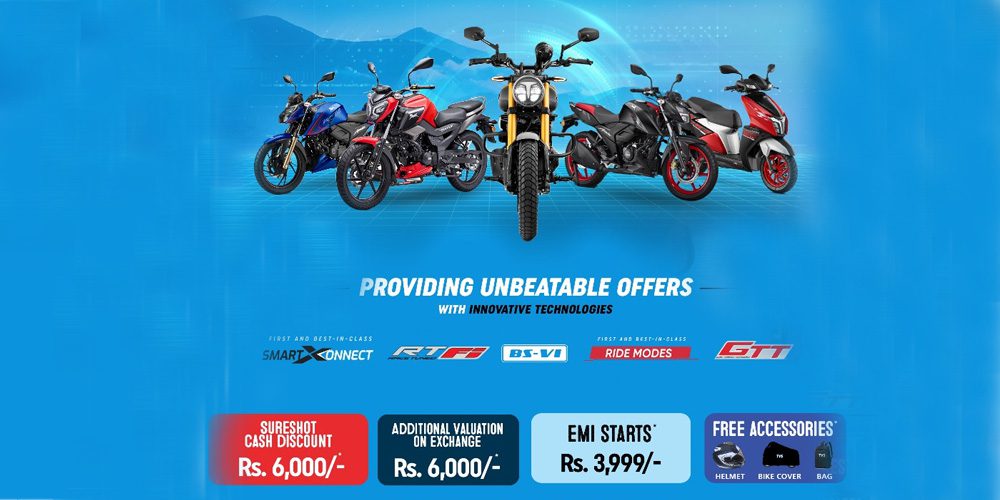 यस सीमित अवधिको अभियानमा ग्राहकहरूले टिभिएसका बाईक तथा स्कुटरको खरिदमा रु. ६ हजार सम्मको क्यास डिस्काउन्टका साथै, पुरानो मोटरसाइकलमा रु. ६ हजार सम्मको थप मूल्याङ्कन र यी प्रस्तावहरूलाई अझ पहुँचयोग्य बनाउन जगदम्बा मोटर्सले बजारकै सबैभन्दा कम रु ३ हजार ९ सय ९९ प्रति महिनाको भ्ःक्ष् पनि उपलब्ध गराएको छ। साथै, ग्राहकहरूले हेल्मेट, बाइक कभर र ब्याग लगायत निःशुल्क सामग्री पनि प्राप्त गर्न सक्नेछन् ।