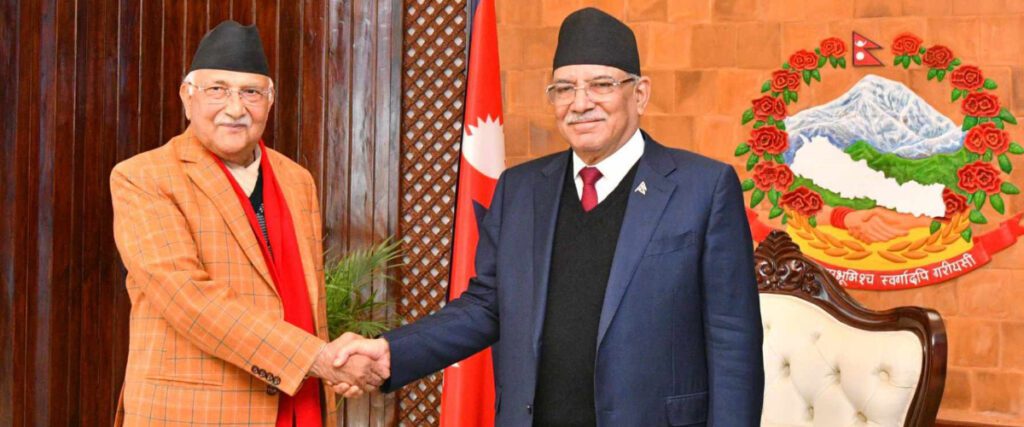 काठमाडौं । प्रधानमन्त्री पुष्पकमल दाहाल प्रचण्ड र नेकपा एमालेका अध्यक्ष केपी शर्मा ओलीबिच भेटवार्ता भएको छ । समसामयिक राजनीति र आर्थिक वर्ष २०८१/८२ को बजेटबारे उनीहरूबिच छलफल भएको स्रोतले बताएको छ ।