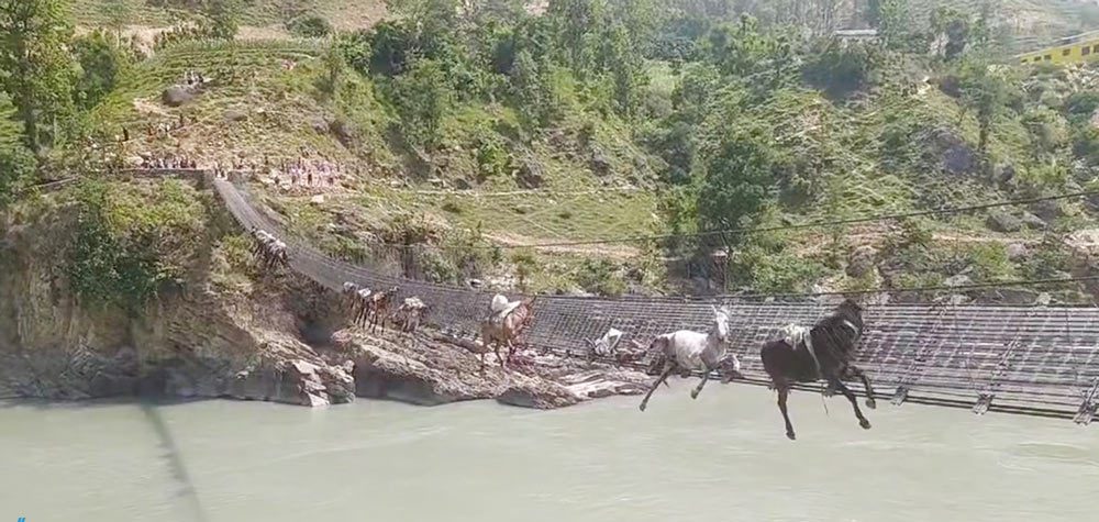 दैलेख र अछाम जोड्ने यो पुलका तारजाली कमजोर भएर चुँडिएसँगै चामल बोकेर फर्किएका खच्चडहरू फसेका थिए ।