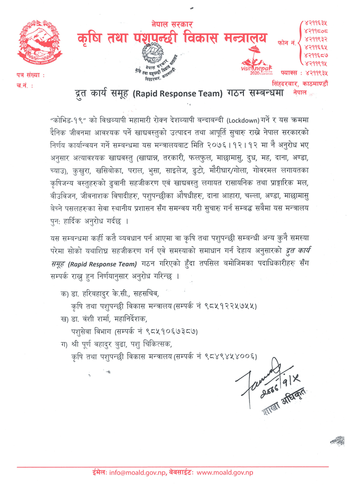 त्यस्तै कुखुरा, खसिबोका, पराल, भुसा, साइलेज, ढुटो, मौरीघार, गोबरमल, रासायनिक तथा प्रांगारिक मल, बीउबिजन, जीवनाशक विषादीहरु पशुपन्छीका औषधिहरु, दाना आहारा, चल्ला बेच्ने पसलहरुका सेवा स्थानीय प्रशासनसँग समन्वय गरी सुचारु गर्न मन्त्रालयले अनुरोध गरेको हो।