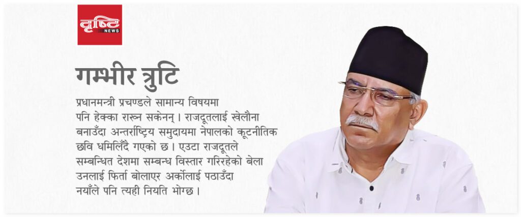 कूटनीतिक अपरिपक्वताको हद यतिसम्म नाघेको छ कि, प्रधानमन्त्री पुष्पकमल दाहाल ‘प्रचण्ड’ भारतीय प्रधानमन्त्री नरेन्द्र मोदीको शपथ समारोहमा जानु तीन दिनअघि सरकारले राजदूत फिर्ता बोलायो ।