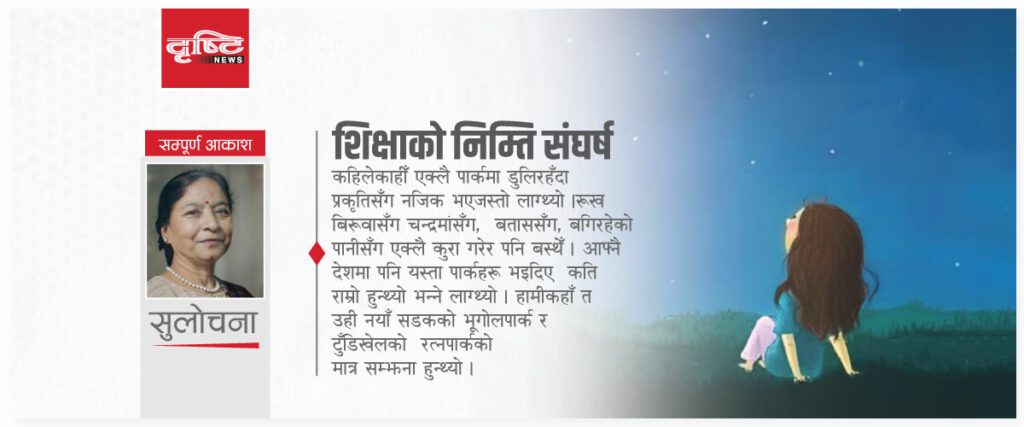 ऊ पनि किन्डरगार्टेन जानु अगाडि मसँग भनेजस्तै ज्यादै नै ज्ञानी भइदिई । ‘मामुलाई सम्झे पनि रुँदिन’ भनेकी थिई । कति गाह्रो भयो होला ! यो सब शिक्षाको निम्ति भनेर गरेको संघर्षको कथा हो ।