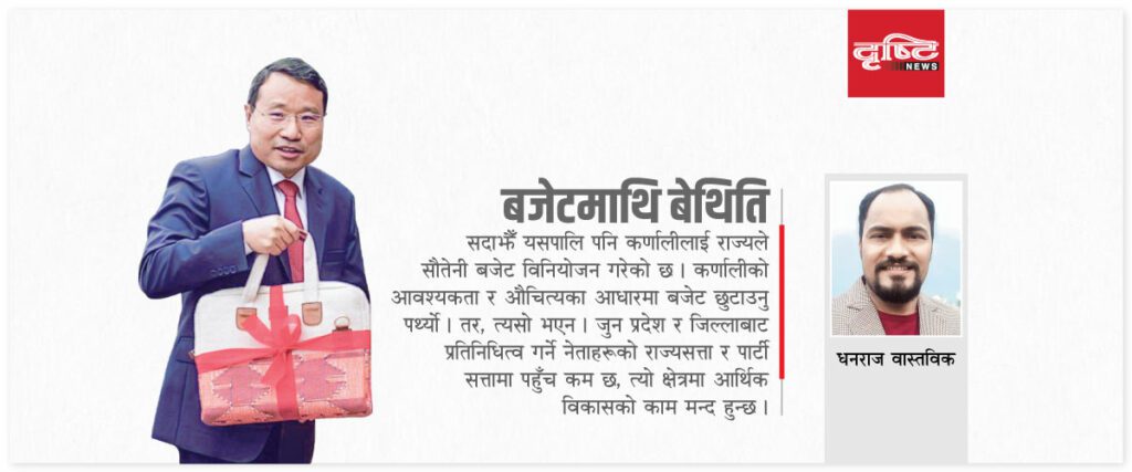 सदाझैँ यसपालि पनि कर्णालीलाई राज्यले सौतेनी बजेट विनियोजन गरेको छ । कर्णालीको आवश्यकता र औचित्यका आधारमा बजेट छुटाउनु पर्थ्यो । तर, त्यसो भएन । जुन प्रदेश र जिल्लाबाट प्रतिनिधित्व गर्ने नेताहरूको राज्यसत्ता र पार्टी सत्तामा पहुँच कम छ, त्यो क्षेत्रमा आर्थिक विकासको काम मन्द हुन्छ ।