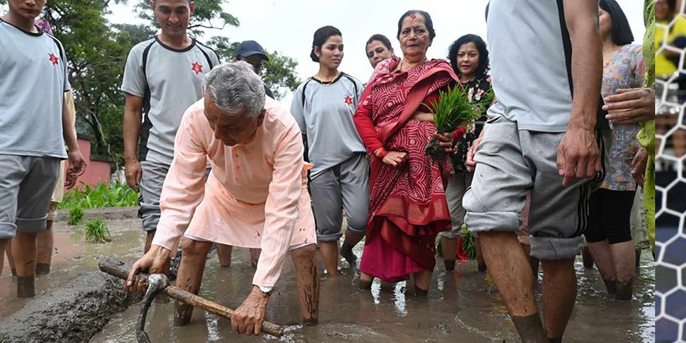 रोपाइँ शुभारम्भ गर्दै राष्ट्रपति पौडेलले कृषि पेशा, श्रमको सम्मानको संस्कृति र धान उत्पादनलाई प्रोत्साहन दिन प्रतिकात्मक रुपमा रोपाइँमा सहभागी भएको बताए ।