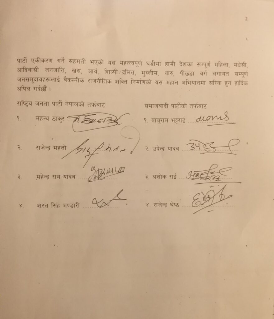 राष्ट्रिय जनता पार्टी नेपाल र समाजवादी पार्टीले एकताको घोषणा गरेका छन् । सरकारले ल्याएको अध्यादेशले पार्टी फुट्न लागेपछि उनीहरुले बुधबार मध्यराती पार्टी एकतामा हस्ताक्षर गरेका हुन् । एकतापछि पार्टीको नाम जनता समाजवादी राखेका छन् ।