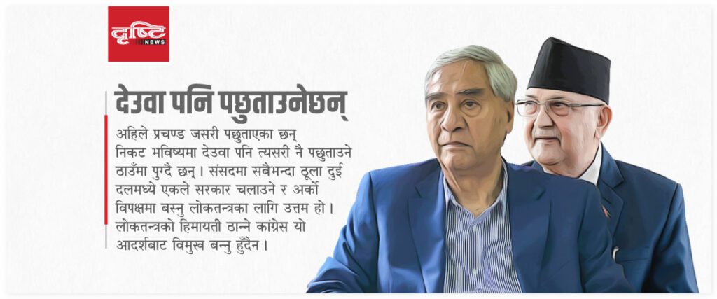 अहिले प्रचण्ड जसरी पछुताएका छन् निकट भविष्यमा देउवा पनि त्यसरी नै पछुताउने ठाउँमा पुग्दै छन् । संसदमा सबैभन्दा ठूला दुई दलमध्ये एकले सरकार चलाउने र अर्को विपक्षमा बस्नु लोकतन्त्रका लागि उत्तम हो । लोकतन्त्रको हिमायती ठान्ने कांग्रेस यो आदर्शबाट विमुख बन्नु हुँदैन ।
