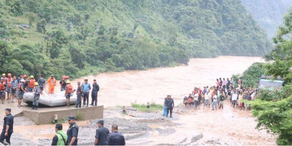 fचितवनको भरतपुर महानगरपालिका–२९ सिमलतालस्थित नारायणगढ–मुग्लिन सडकमा शुक्रबार आएको लेदोसहितको पहिरोले दुईवटा गुडिरहेको बसलाई बगाएर त्रिशूलीमा डुबाउँदा ५० भन्दा बढी यात्रु बेपत्ता भएका छन् । बससहित उनीहरुको खोजी तथा उद्धार बिहानैदेखि गोताखोरसहितको प्रहरी टोली त्रिशूली र नारायणी नदी क्षेत्रमा खटिएका छन् । बेपत्ता बस र यात्रुको खोजी गर्न प्रहरीले चुम्बक र वाटर ड्रोन क्यामेरा समेत प्रयोगमा ल्याएको छ ।
