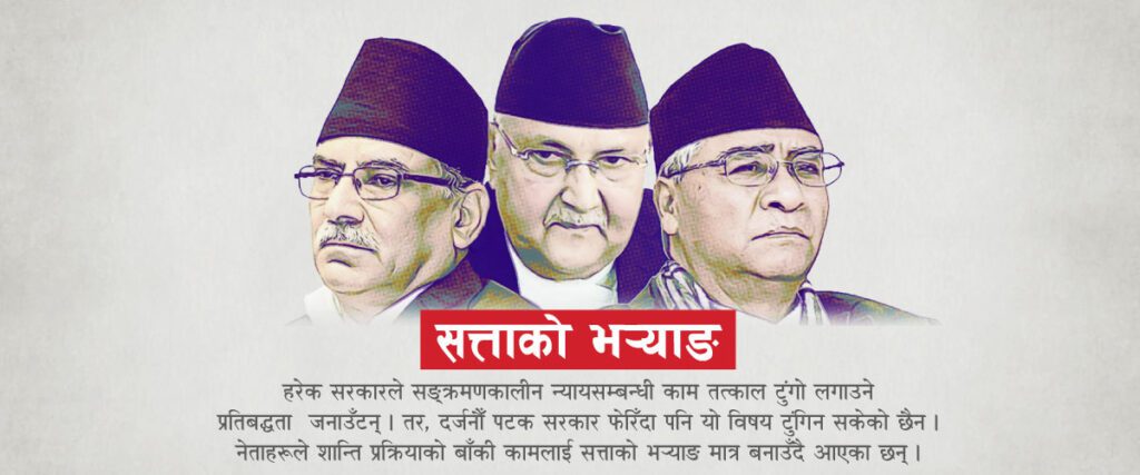 हरेक सरकारले सङ्क्रमणकालीन न्यायसम्बन्धी काम तत्काल टुंगो लगाउने प्रतिबद्धता जनाउँछन् । तर, दर्जनौँ पटक सरकार फेरिँदा पनि यो विषय टुंगिन सकेको छैन । नेताहरूले शान्ति प्रक्रियाको बाँकी कामलाई सत्ताको भ¥याङ मात्र बनाउँदै आएका छन् ।