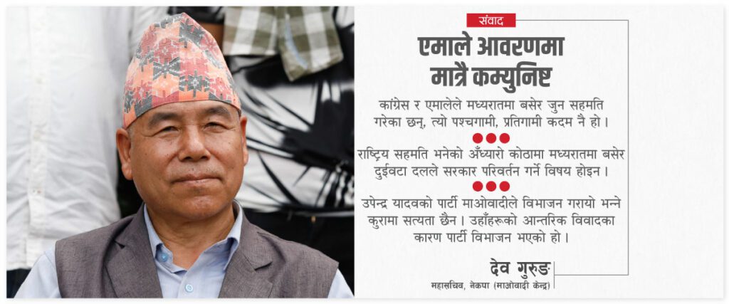 कांग्रेस–एमाले गठबन्धन, संविधान संशोधन, एमाले माओवादी गठबन्धन भत्किनुको रहस्य, समाजवादी मोर्चाको भविष्य लगायतका विषयमा नेकपा (माओवादी केन्द्र)का महासचिव एवं समाजवादी मोर्चाको सचिवालय सदस्य देव गुरुङसँग दृष्टिले गरेको कुराकानीको सम्पादित अंश–
