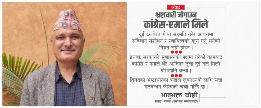 विपक्ष दलहरूले विभिन्न काण्डबाट जोगिन कांग्रेस–एमाले गठबन्धन बनेको दाबीसमेत गर्दै आएका छन् । त्यसैले पुराना फाइल बन्द हुने देखि नयाँ काण्डहरू आउने आशंका विपक्ष दलका नेताहरूको छ । कांग्रेस–एमाले गठबन्धन, संविधान संशोधन, चर्चामा रहेका विभिन्न काण्डका साथै विपक्षी दलहरूको भूमिकालगायतका विषय निवर्तमान मन्त्री तथा एकीकृत समाजवादीका सांसद भानुभक्त जोशीसँग दृष्टिले गरेको कुराकानीको सम्पादित अंश ।
