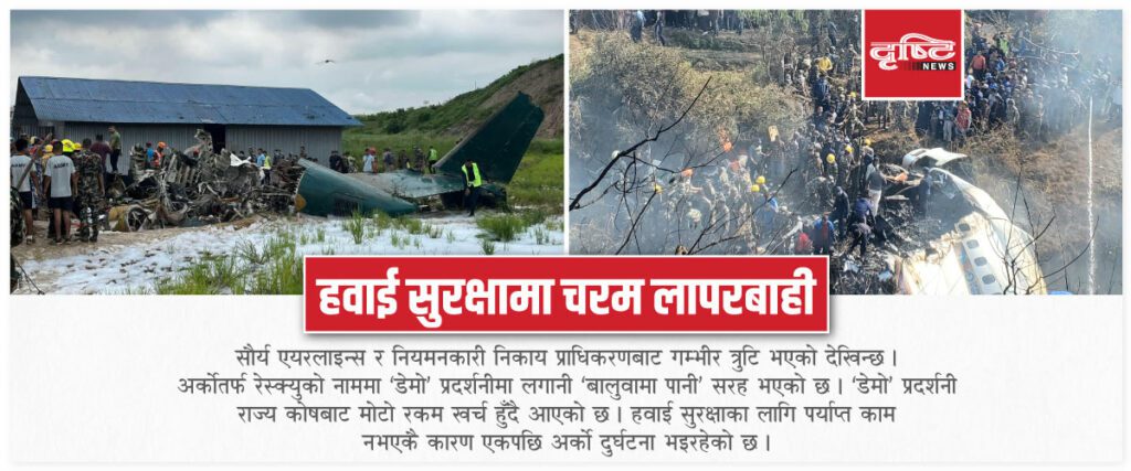नीतिगत र कार्यान्वयन पक्ष बलियो बनाउँदै दुर्घटना न्यूनीकरणमा लाग्नुको विकल्प छैन । त्यसो गरिएन भने हवाई दुर्घटनाबाट ठूलो जनधनको क्षति पुग्नेछ । त्यसबाट पर्यटन क्षेत्रसमेत धराशायी बन्दै जानेछ । नेपालमा पर्यटकहरू आवातजावत गर्ने भनेकै हवाई सेवाबाट हो । त्यही सेवा असुरक्षित भयो भने अकाल मृत्युवरण गर्न कोही पनि नेपाल आउँदैनन् ।