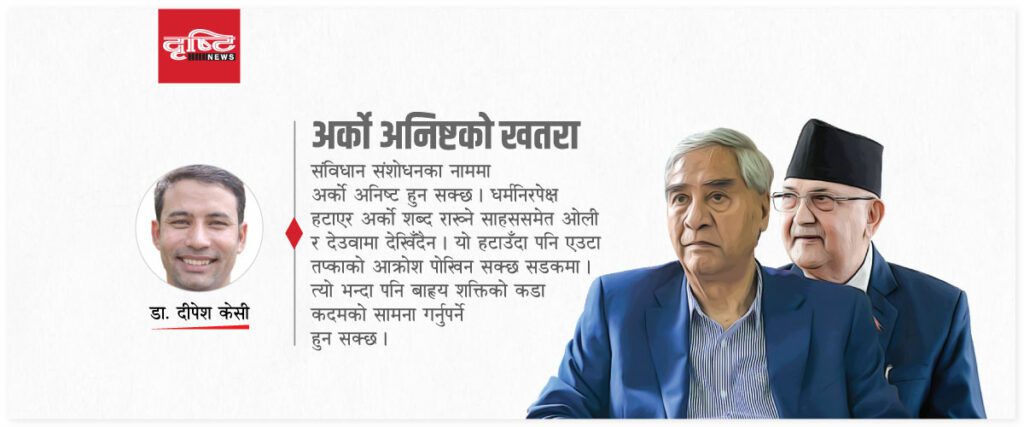 संविधान संशोधनका नाममा उनीहरूलाई चिढ्याएमा अर्को अनिष्ट हुन सक्छ । धर्मनिरपेक्ष हटाएर अर्को शब्द राख्ने साहससमेत ओली र देउवामा देखिँदैन । यो हटाउँदा पनि एउटा तप्काको आक्रोश पोखिन सक्छ सडकमा ।