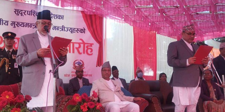 काठमाडौं । सुदूरपश्चिमका नवनियुक्त मुख्यमन्त्री कमलबहादुर शाहले पद तथा गोपनीयताको शपथ लिएका छन् । मुख्यमन्त्री शाहले सोमबार प्रदेश प्रमुख नजिर मियाँबाट पद तथा गोपनियताको शपथ लिएका हुन् ।