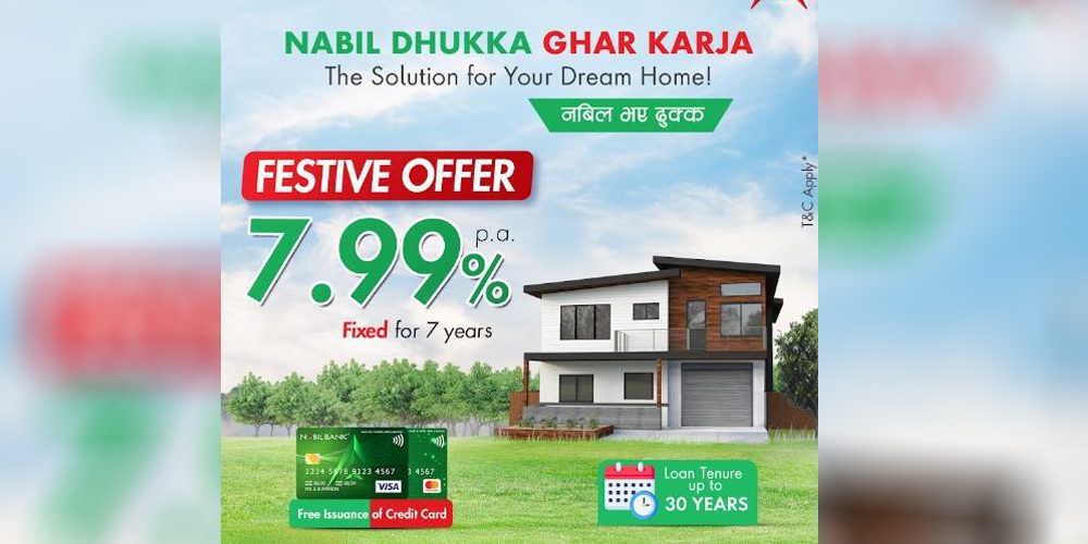 बैंकले आधार दर सरह नै ब्याजदरमा घर कर्जा दिने छ । ‘नबिल ढुक्क घर कर्जा, नबिल भए ढुक्क’ योजना अन्तर्गत ७.९९ प्रतिशत ब्याजदरमै घर कर्जा उपलब्ध गराउने भएको हो ।