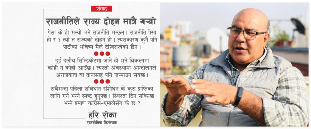 एमाले र कांग्रेस वर्गच्यूत भएका छन् । सामान्य जनता, गरिब, मजदुर, किसानको पक्षमा लाग्ने एमाले अहिले मध्यम र उच्चमध्यम वर्गीय मानिसको पक्षमा छ । त्यही खाले पोजिसन कांग्रेसको पनि छ । माओवादी र एकीकृत समाजवादीमा पनि त्यही खालको चरित्र छ । सामान्य मानिसको वर्गसँग उनीहरू कटिएका छन् । जुन वर्ग उनीहरूले सोचिराखेका छन्, त्यसले मात्रै नेपालमा दुई दलीय सिस्टम टिक्दैन । धेरै पार्टी हुँदा मात्रै नेपालमा लोकतन्त्र टिक्ने हो । दुई दलीय सिन्डिकेटमा जाने हो भने विकल्पमा कोही न कोही आउँछ । त्यस्तो अवस्थामा आन्दोलनले अराजकता वा तानासाह पनि जन्माउन सक्छ ।