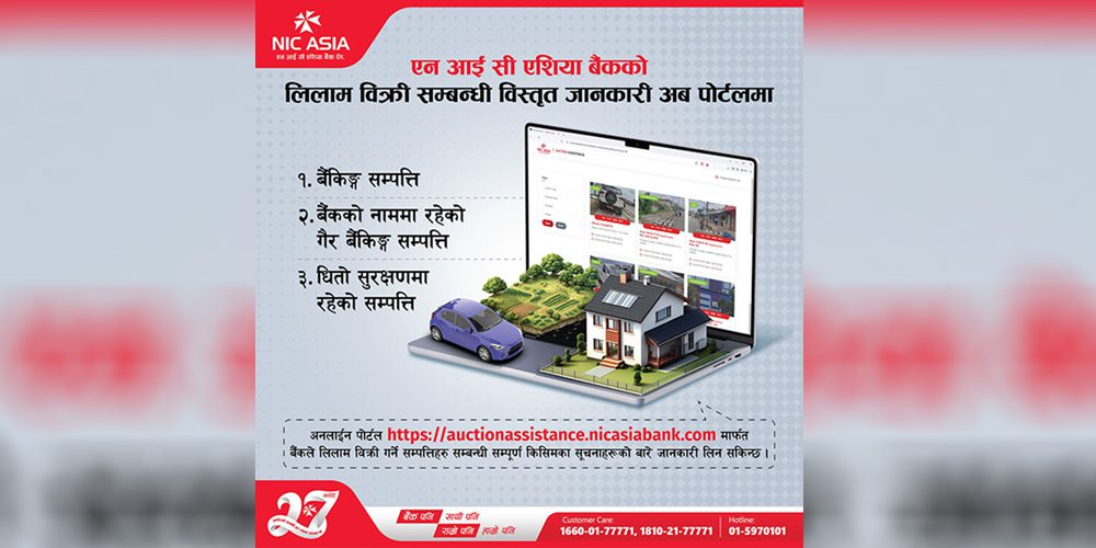 काठमाडौं । एनआईसी एसिया बैंक लिमिटेडले लिलाम बिक्रीसम्बन्धी अनलाइन पोर्टल सार्वजनिक गरेको छ ।